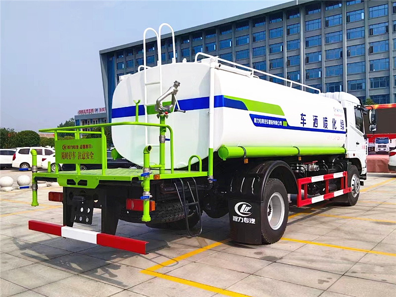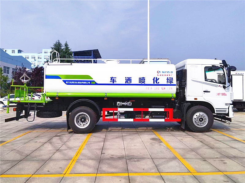 上裝配置:罐體采用國標Q235碳鋼,罐體厚度4mm,前后封頭5MM加厚型,罐體實際容積15-16立方(15~16噸),產品質量成熟可靠,設計先進合理,比同類灑水泵壓力大、吸程遠、使用壽命長,可泵進泵出。前沖、后灑、側噴,消防栓接口,帶后工作平臺及綠化高炮(可全方位旋轉,可連續調成直沖狀、大雨、小雨、毛毛雨),水位計,兩根等長輸水管,其余標配。