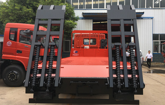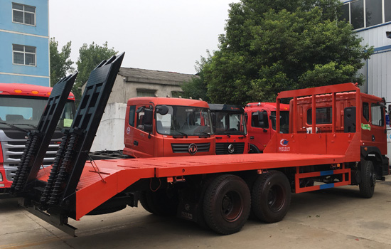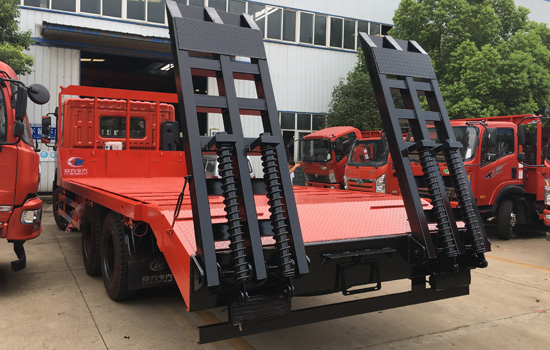 上裝配置:平板底板橫梁采用120*120*5mm方管,底板采用8mm、10mm或12mm花紋板,帶加密斜支撐,爬梯采用雙彈簧加強型設計,采用三道筋+雙彈簧加固焊接,可選裝液壓爬梯或折疊加長型液壓爬梯,斜坡處帶后支腿,平板有效板長7.5米/8米兩種可選(均含斜坡),寬2.5米(可手動伸展至3.2米),可以選擇貨箱帶欄板設計,平板離地高度1.15米,28噸及以下噸位挖機首選車型!